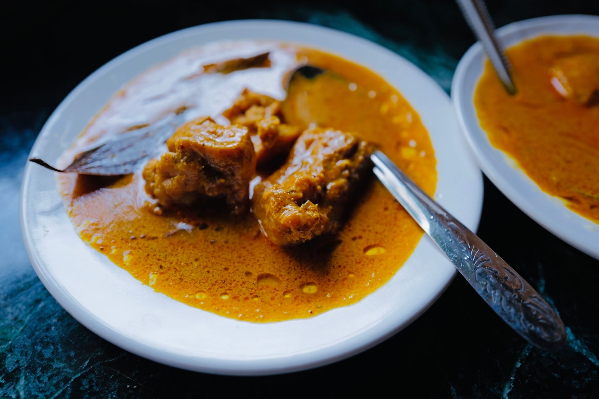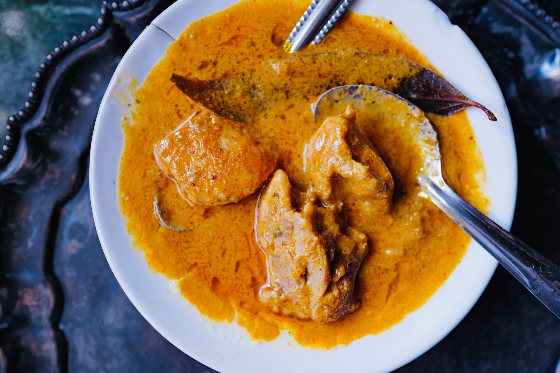 ココナッツをベースにしたクリーミーでコクのあるパールオレンジカラーのグレイビーで鶏モモ肉を煮込んだチキンカレー。老舗ムスリムレストランの味わい。