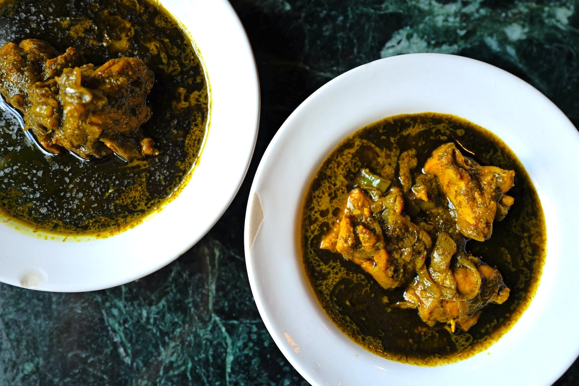 ローストしパウダーにしたカレーリーフの青苦く芳ばしい味わいと、フレッシュカレーリーフの爽やかな香りワイルドで美しいディープグリーンのグレイビー