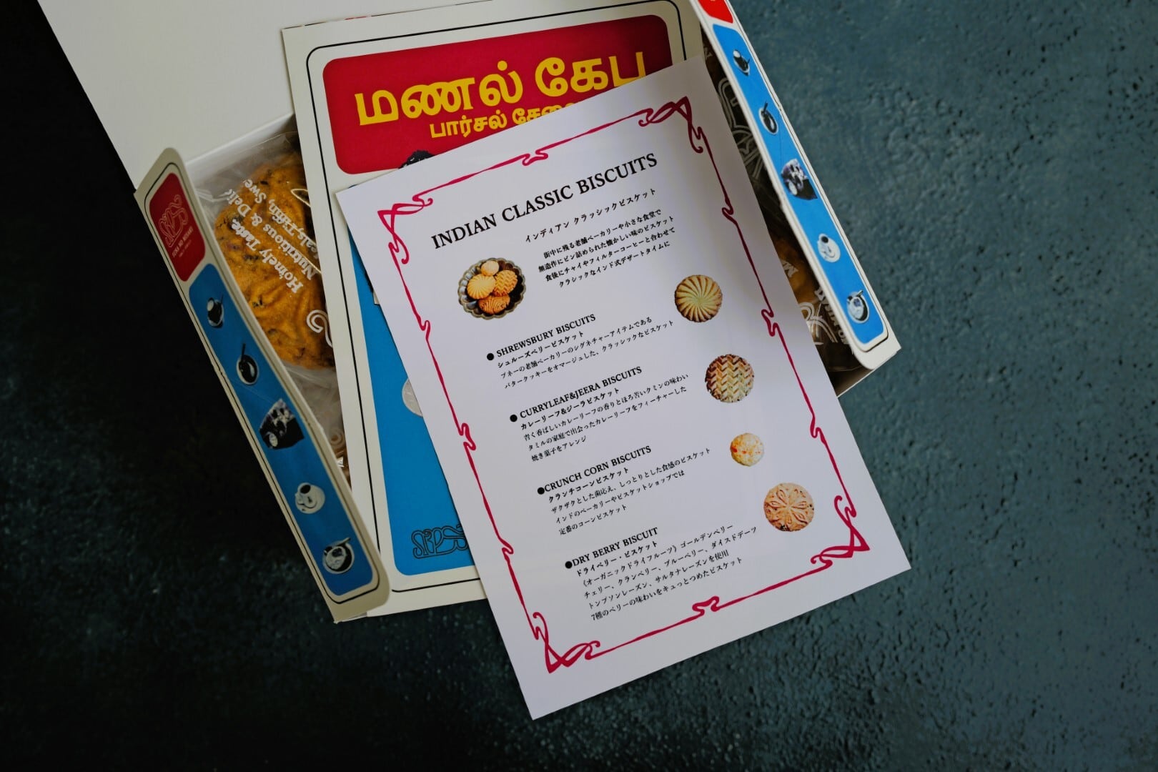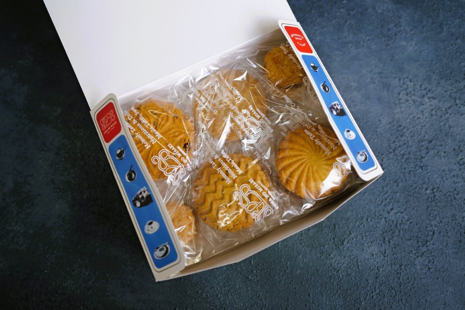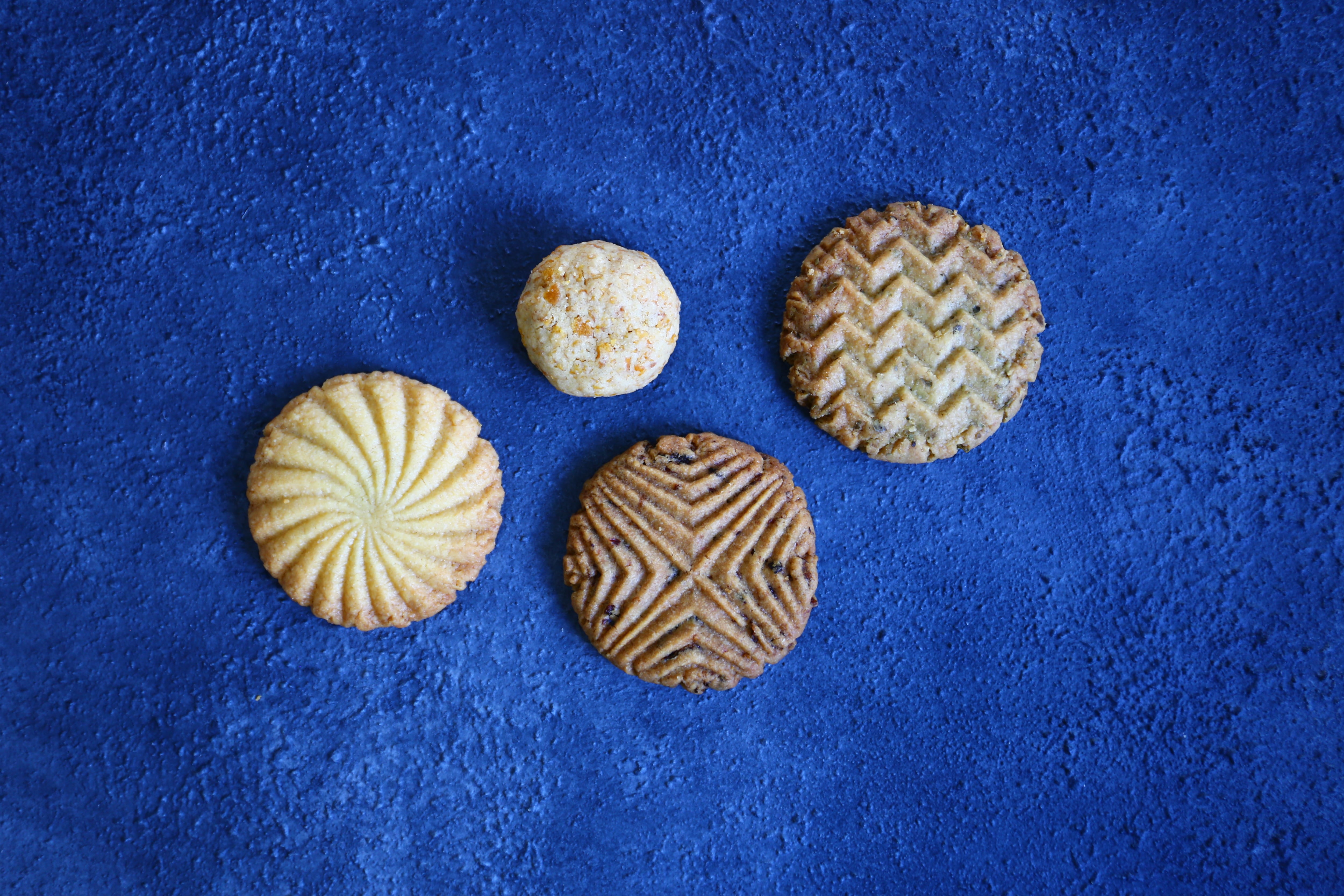 シュルーズベリービスケット×5、カレーリーフ&ジーラビスケット×5、クランチコーンビスケット×5、ドライベリー・ビスケット×5